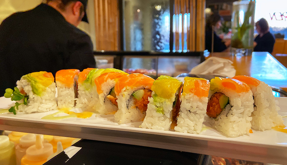 Sushi Rolls are made with seasoned sushi rice in a nori, or seaweed. These rolls are filled with various ingredients, raw or cooked. Small rolls are cut into 6 to 8 bite-size pieces and large rolls are typically cut into 10 pieces.